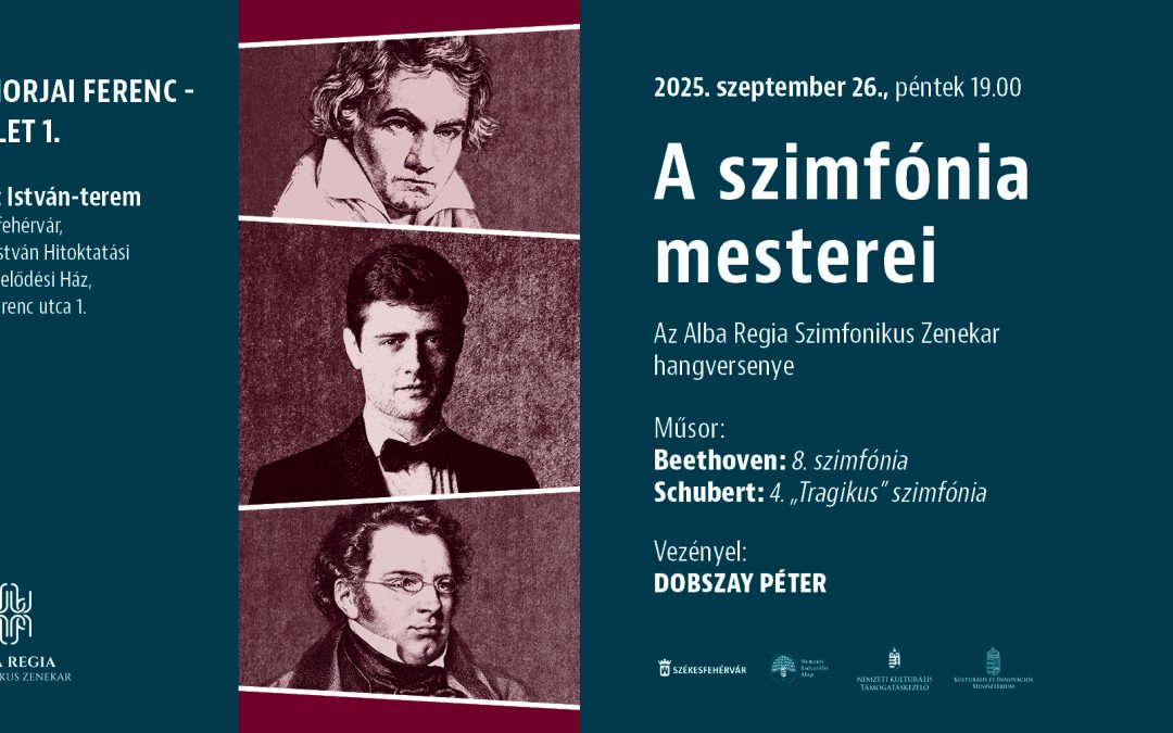 A szimfónia mesterei és az Alba Regia Szimfonikus Zenekar szeptember 26-án, pénteken este 7-kor nyitja meg a szimfonikus szezont a Szent István-teremben (Szent István Hitoktatási és Művelődési Ház, Székesfehérvár, Liszt Ferenc utca 1.) Jegyek még kaphatóak!